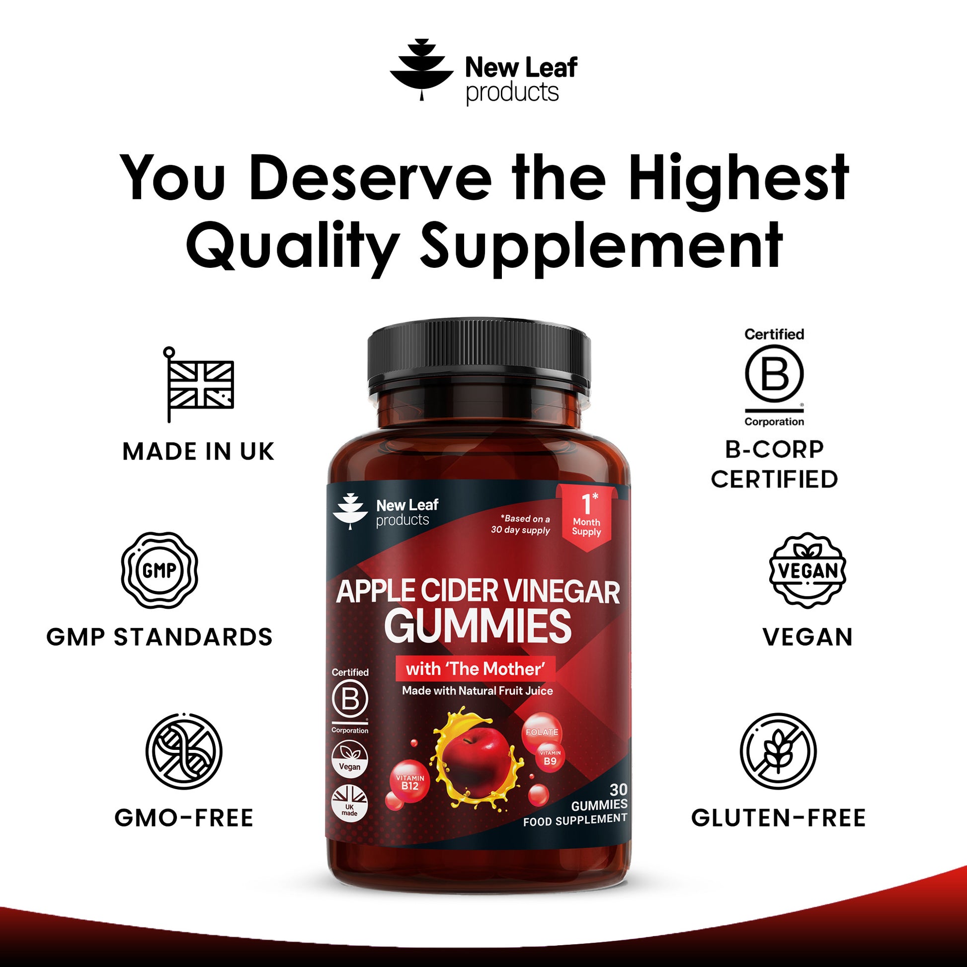 Each gummy contains 500mg of pure Apple Cider Vinegar equivalent to 10ml (2 teaspoons) and includes essential B vitamins, pomegranate and beetroot. It's never been easier to take supplements of the highest quality with New Leaf's ACV Vitamins Gummies.