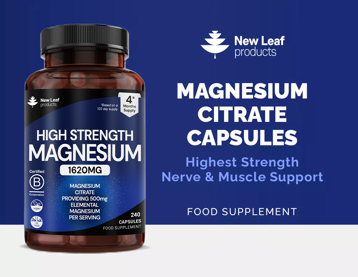 New Leaf magnesium capsules contains 500mg of Magnesium Citrate Elemental 1620mg (the most bioavailable form of magnesium) per serving of 2 capsules. Each bottle is supplied with 240 easy-to-swallow vegan capsules that will last for 4 months.