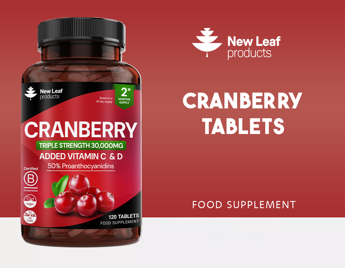 New Leaf's Cranberry Tablets offer a triple strength formulation, providing an impressive 30,000mg of cranberry extract per serving. Enriched with Vitamin C and D, these tablets are designed to support your overall well-being and immune system. Each bottle contains 120 tablets, providing a convenient 2-month supply. With 2 tablets recommended per day, you can enjoy the benefits of this potent cranberry supplement effortlessly.