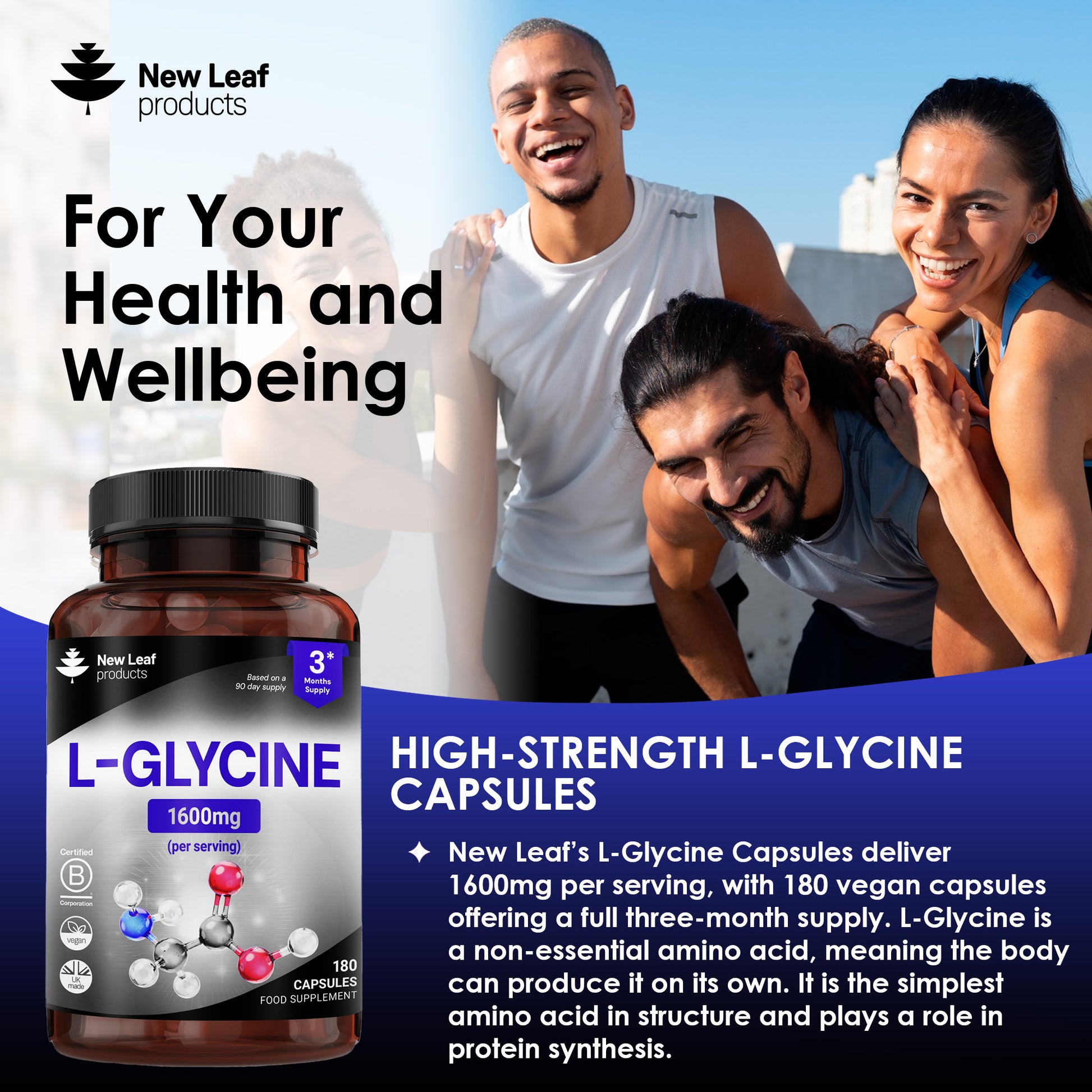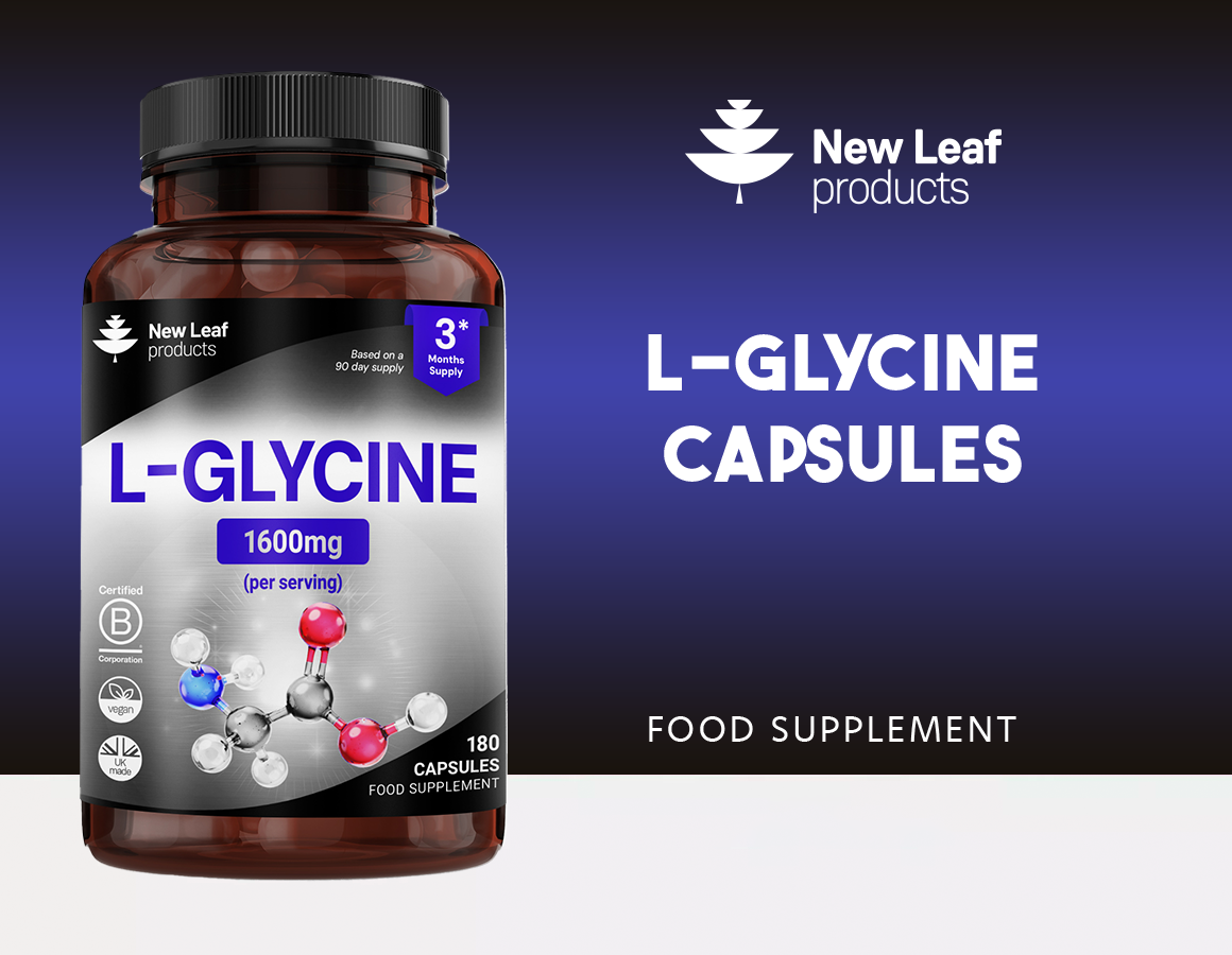 New Leaf’s L-Glycine Capsules deliver 1600mg per serving, with 180 vegan capsules offering a full three-month supply. L-Glycine is a non-essential amino acid, meaning the body can produce it on its own. It is the simplest amino acid in structure and plays a role in protein synthesis. L-Glycine is also found naturally in high-protein foods such as meat, fish, dairy, legumes, and gelatin.