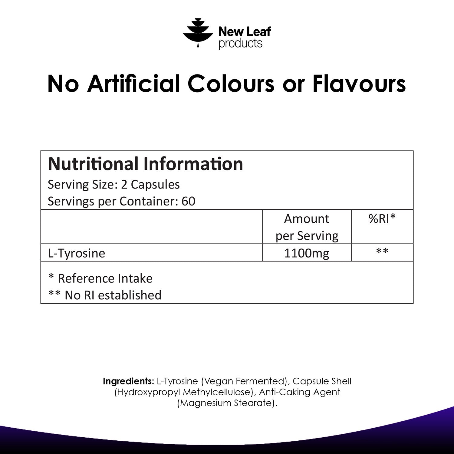 As a building block of protein, L-Tyrosine is widely used in nutritional supplements for those looking to support their amino acid intake. New Leaf’s formula uses a pure, high-strength form of L-Tyrosine in an easy-to-swallow vegan capsule. Whether you're supplementing a restricted diet or aiming to optimise your nutrient intake, this amino acid supplement offers a clean and reliable source of L-Tyrosine.