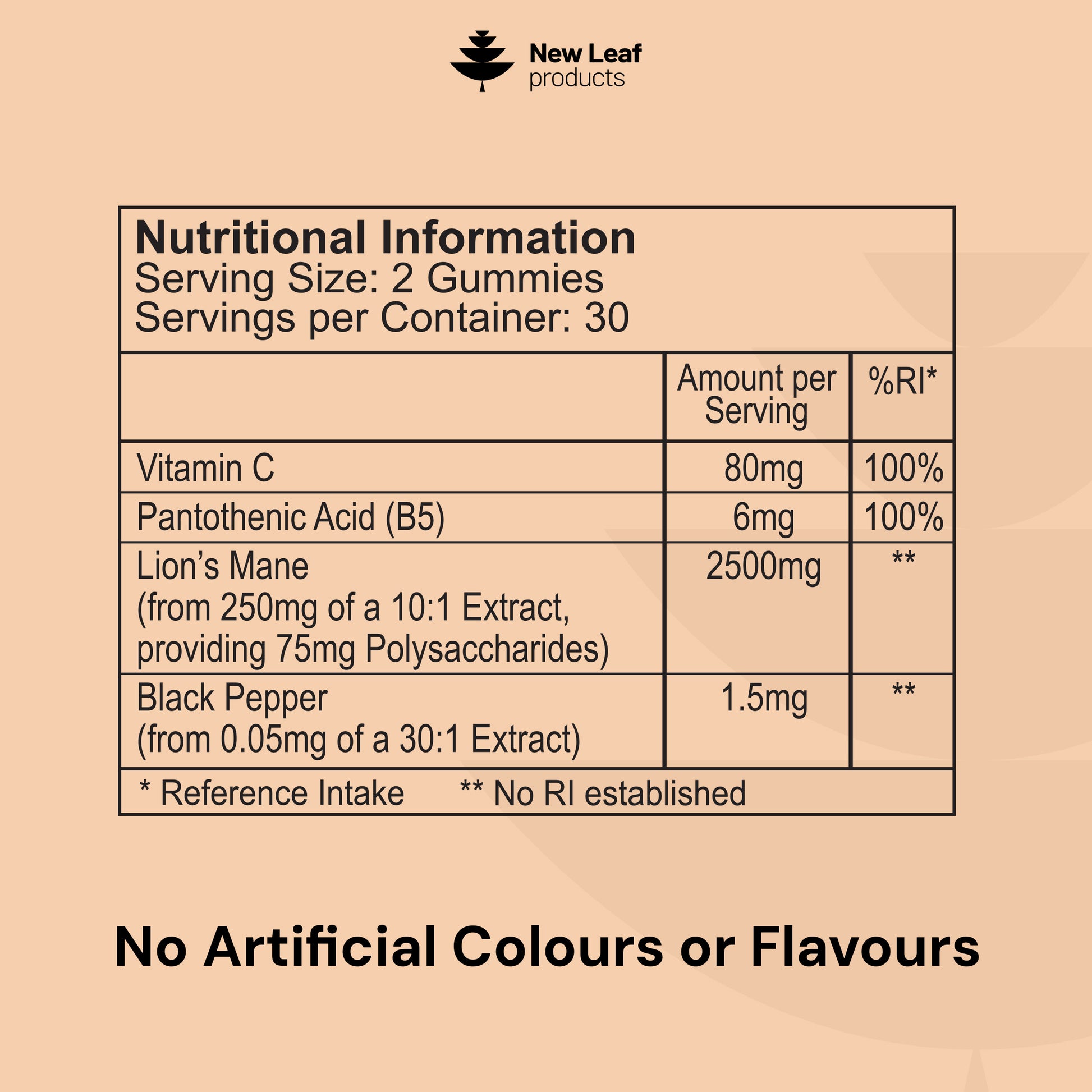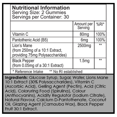Experience the power of mushroom gummies with lion’s mane, carefully crafted with Vitamin C, Pantothenic Acid (B5), and Black Pepper in a delicious berry flavor. Each daily serving provides 2500mg of Lion’s Mane from 250mg of a high-potency 10:1 extract.