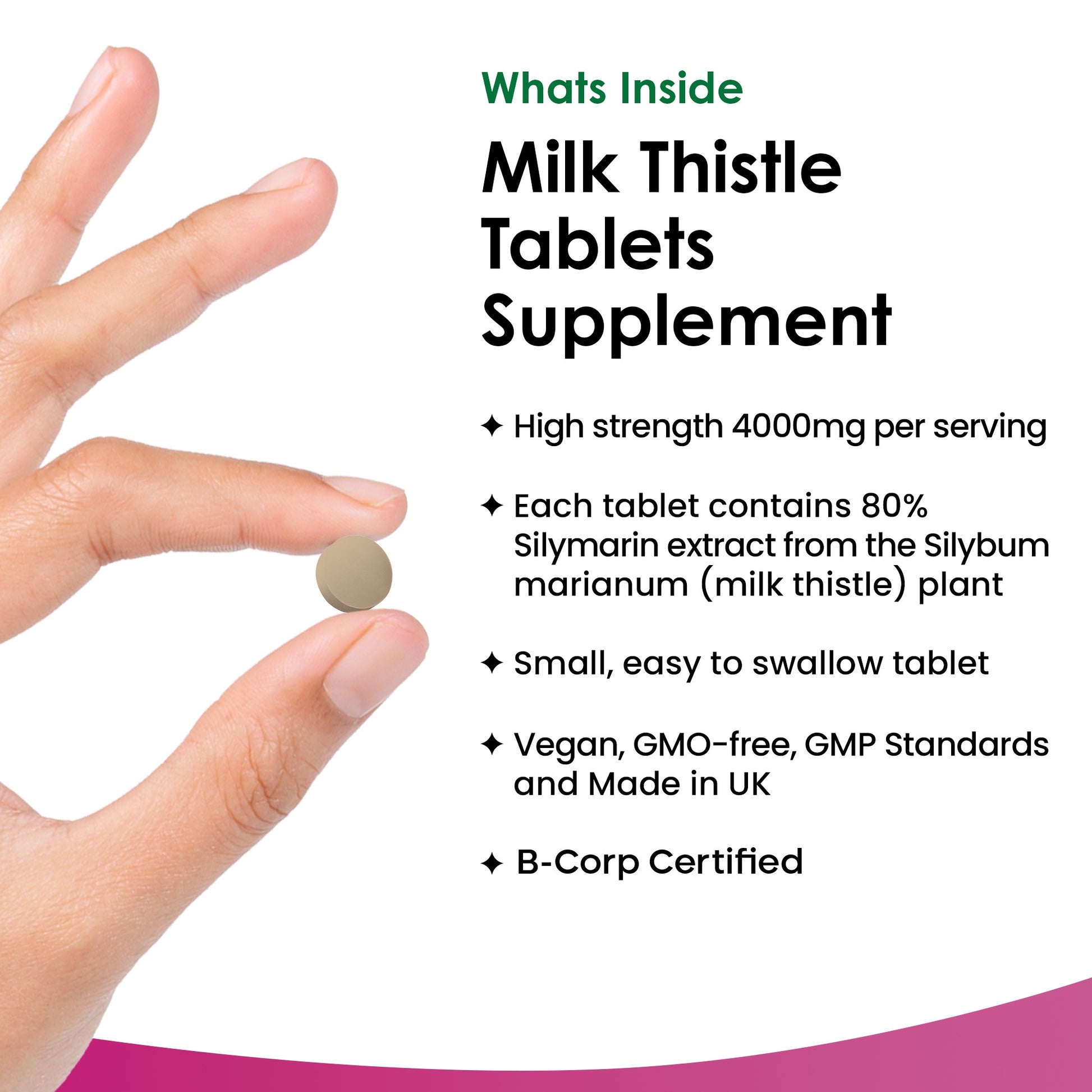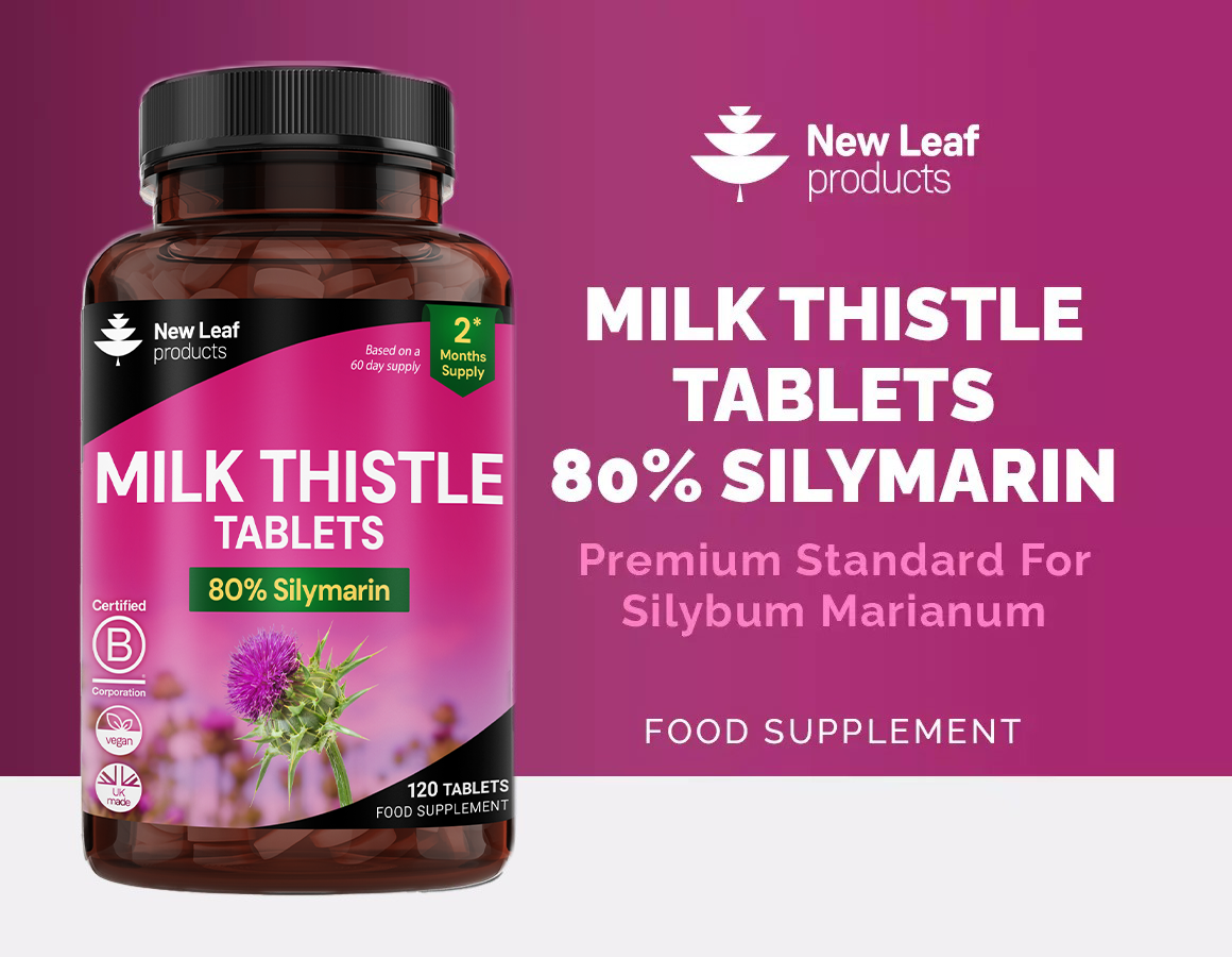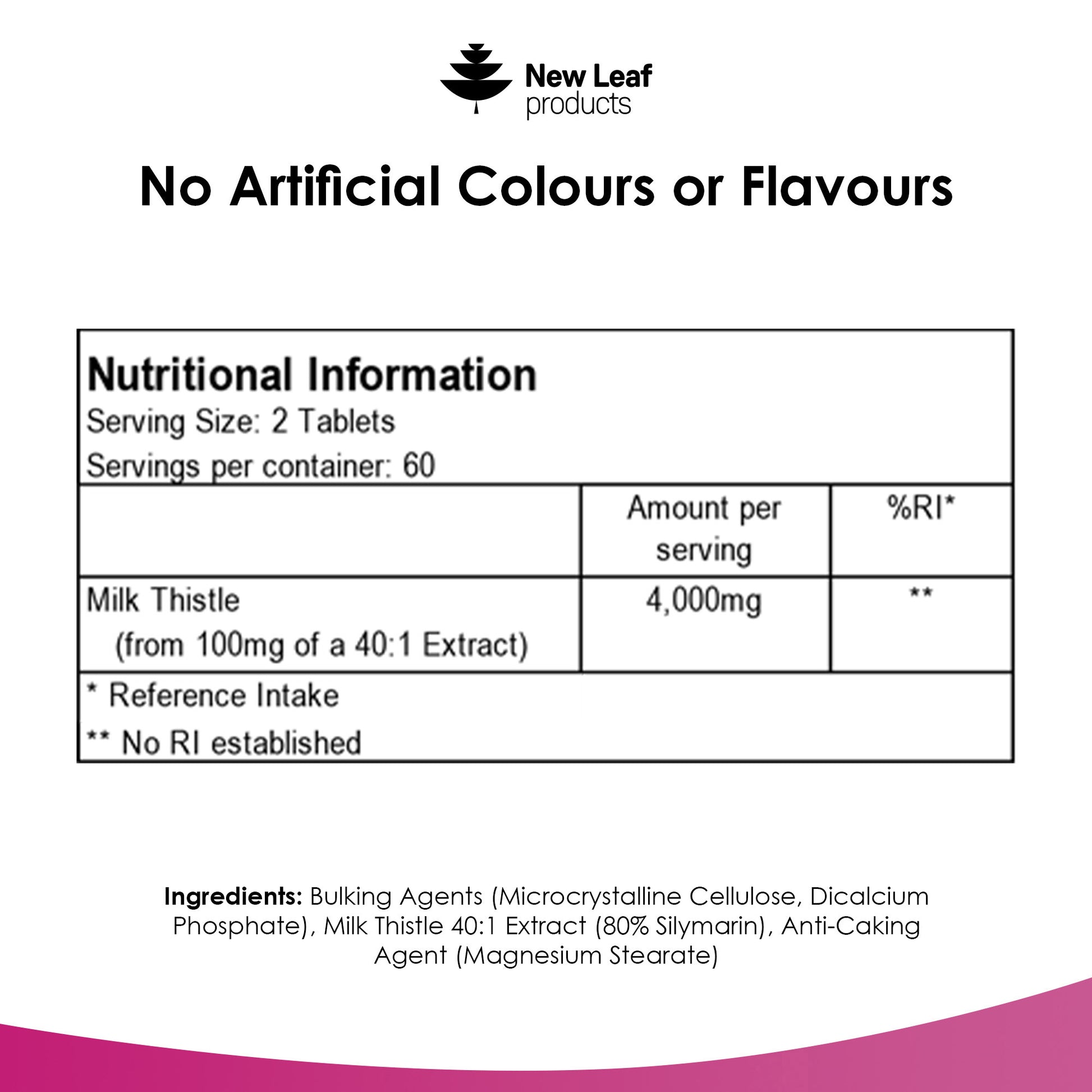 Each tablet contains 80% Silymarin, Silymarin is extracted from the Silybum marianum (milk thistle) plant.