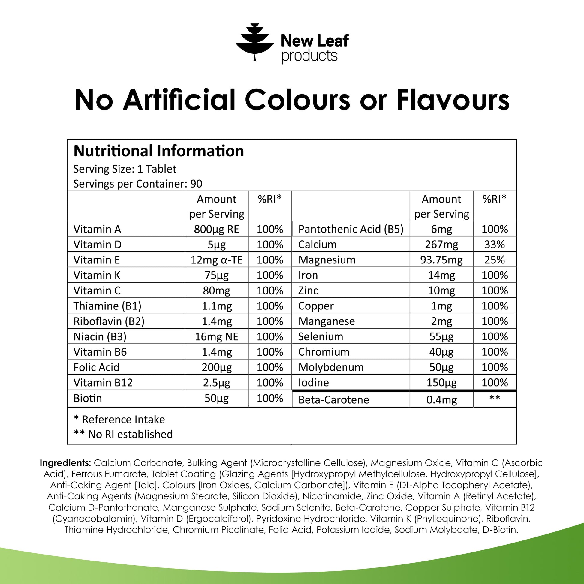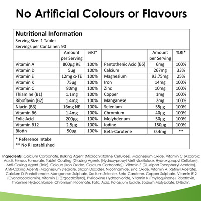 Each tablet will help support your body with its daily needs. Vitamin A,C,D, Zinc Contributes to the normal function of the immune system. Vitamin D & K contributes to the maintenance of normal bones and teeth.
