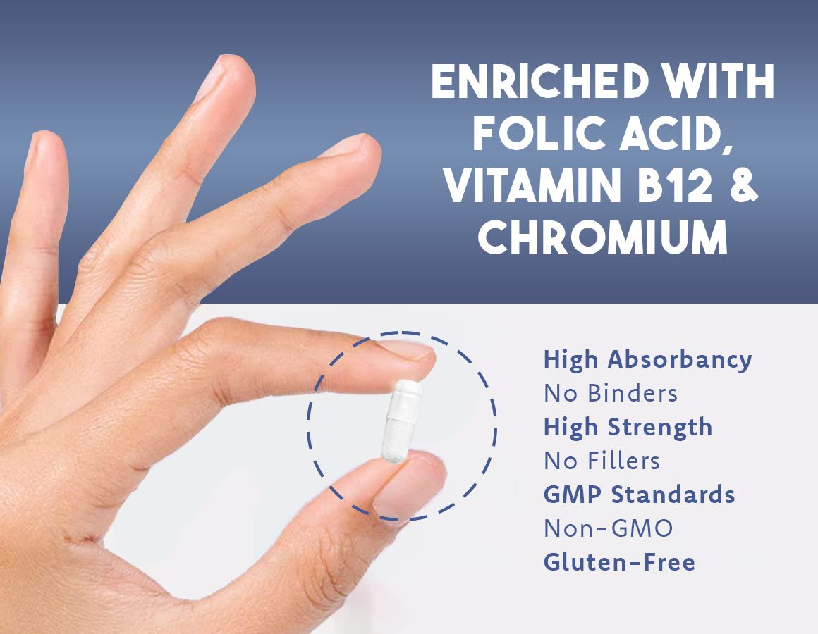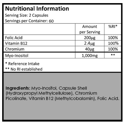 Myo-Inositol, Capsule Shell HPMC, Chromium Picolinate, Folic Acid, Vitamin B12 (Methylcobalamin).