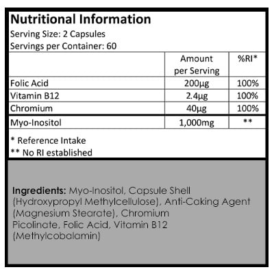 Myo-Inositol, Capsule Shell HPMC, Anti-Caking Agent (Magnesium Stearate), Chromium Picolinate, Folic Acid, Vitamin B12 (Methylcobalamin).