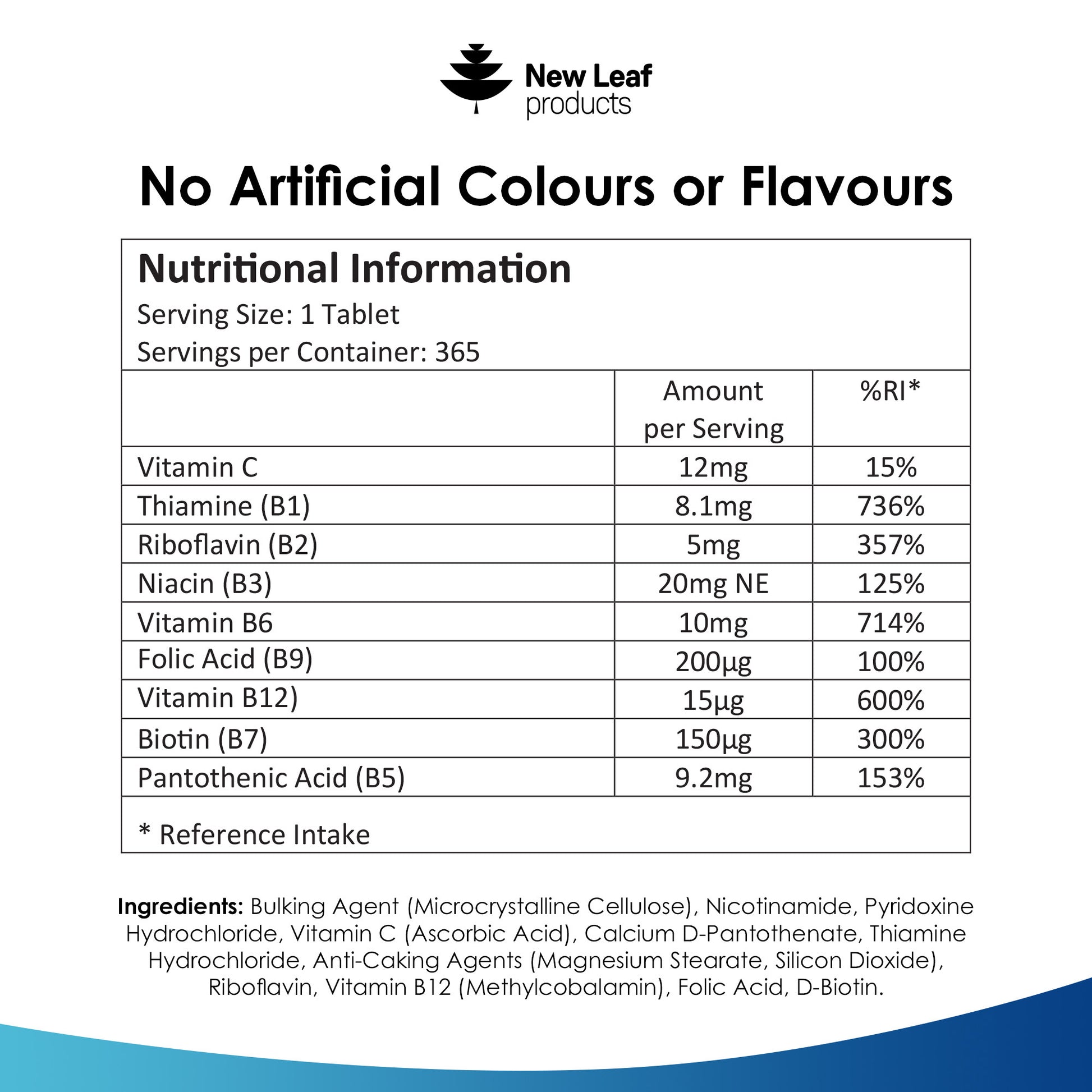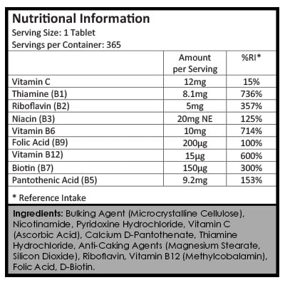 Each micro small vitamin b complex tablet contains all 8 B Vitamins as well as Vitamin C to help absorption. Unique formula that contains full spectrum of B vitamins in accurate dosages. Each bottle contains 365 Tablets.